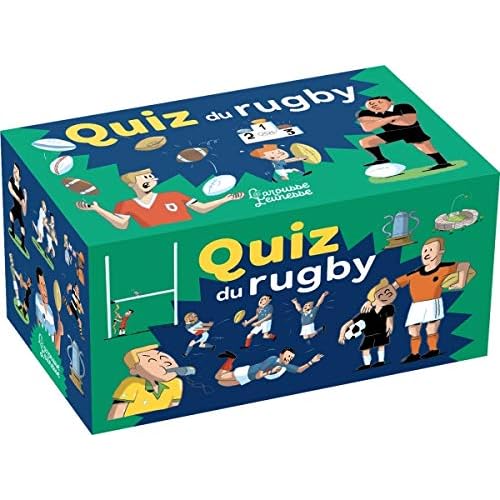 Une boîte renfermant un jeu de type Quiz constituée de :100 cartes à jouer avec, sur chacune, une question et une illustration. Il y a 2 types de questions : des questions à choix (cartes « Solo ») et des questions ouvertes (cartes « Défi »).Les 100 questions sont réparties en 7 thèmes et séparées dans la boîte au moyen de 7 intercalaires.1 mini-livre de 128 pages comportant les règles du jeu du Quiz et les réponses aux 100 questions. Les 100 réponses sont toutes illustrées et accompagnées d’un complément d’informations. Résumé des règles du jeu : Nombre de joueurs : de 2 à 5. - But du jeu : se débarrasser de toutes ses cartes en répondant correctement aux questions et en accumulant le maximum de points (les cartes « Solo » valent 1 point et les cartes « Défi » rapportent 2 points).Exemple de question : - Quel sport ancestral est considéré comme l'ancêtre du rugby ?- Quel poids pèse un ballon officiel de rugby ?- Quel pays possède l'équipe la plus performante de l'histoire du rugby ?- Que signifie le célèbre Ka mate du haka des All Blacks ?- Que signifie réaliser "un grand chelem" lors du Tournoi des Six Nations ?